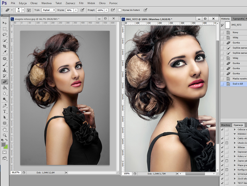 Spoglądam na zegarek, dochodzi prawie 5 rano, w pokoju zrobiło się jakoś cicho, pieczenie oczu od błysków lamp i zmęczenia daje się pomału we znaki. Przede mną na jednym monitorze zdjęcie pięknej kobiety, które wywołuje uśmiech, przywołuje emocje i wspomnienia minionego dnia ale także nie pozwala zasnąć przez endorfinę. Na drugim monitorze te samo surowe zdjęcie modelki, które przemierza bezkresną podróż plastycznych przekłamań w ciemni XXI wieku. Krok po kroku powtarzam zapisane na kartce punkty już od ponad godziny…. kurde już 5:23. W głowie myśl, że chce to skończyć zanim się położę spać. Niczym chirurg z ostrego dyżuru dzierżę kursor myszki jak skalpel w dłoni na sali operacyjnej… przecieram oczy, bo ostrość i kolor zaczyna rozmywać się na monitorze. Jeszcze tylko “powielić bieżącą warstwę, teraz filtr górnoprzwpustowy, zmienić tryb na nakładkę, zmniejszyć krycie, utworzyć dwie krzywe i ponownie wracam do narzędzia pędzel…” 5:40 Niepostrzeżenie i trochę mimochodem wkroczyłem w poważne obszary retuszu, które skłoniły mnie do głębokiej refleksji… porównując dwa zdjęcia nadal nie jestem do końca zadowolony ale jak na pierwszą lekcję satysfakcjonujący rezultat. Na dziś dość, kładę się spać bo o 9 śniadanie i dalej ciąg dalszy obróbki graficznej z Pawłem.