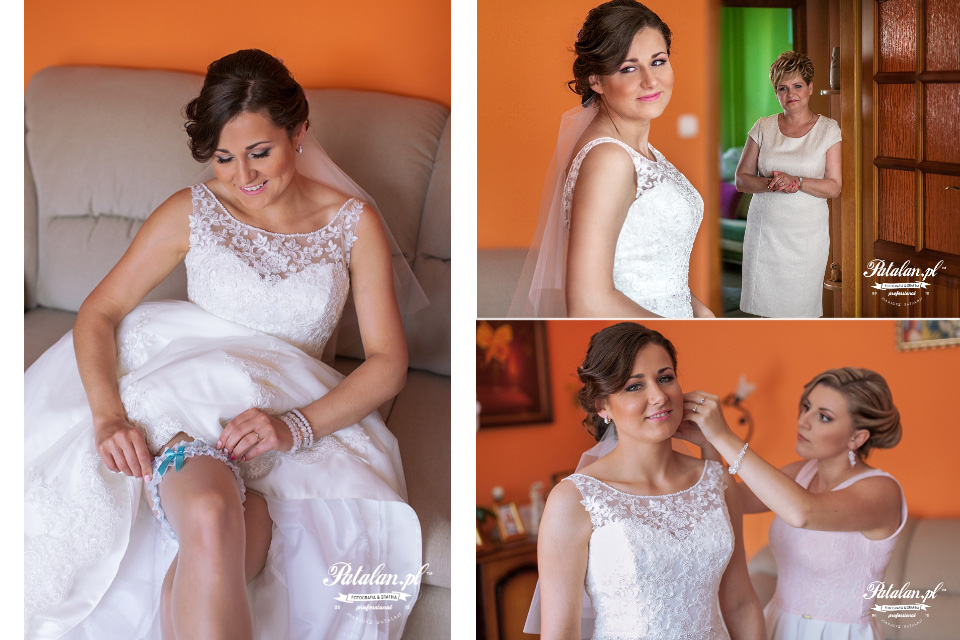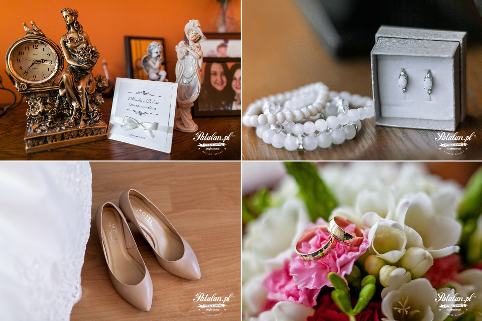 Po makijażu przenieśliśmy się do domu Pani Młodej i Pana Młodego, gdzie czekali już świadkowie. Na pierwszy ogień poszły zdjęcia detali ślubnych, biżuterii, butów, zaproszeń i czekającej na ubranie pięknej sukni ślubnej. Ukradkiem całe przygotowywana Moniki do wielkiego dnia podpatrywała mama, która na pewno była pełna wzruszenia i emocji.