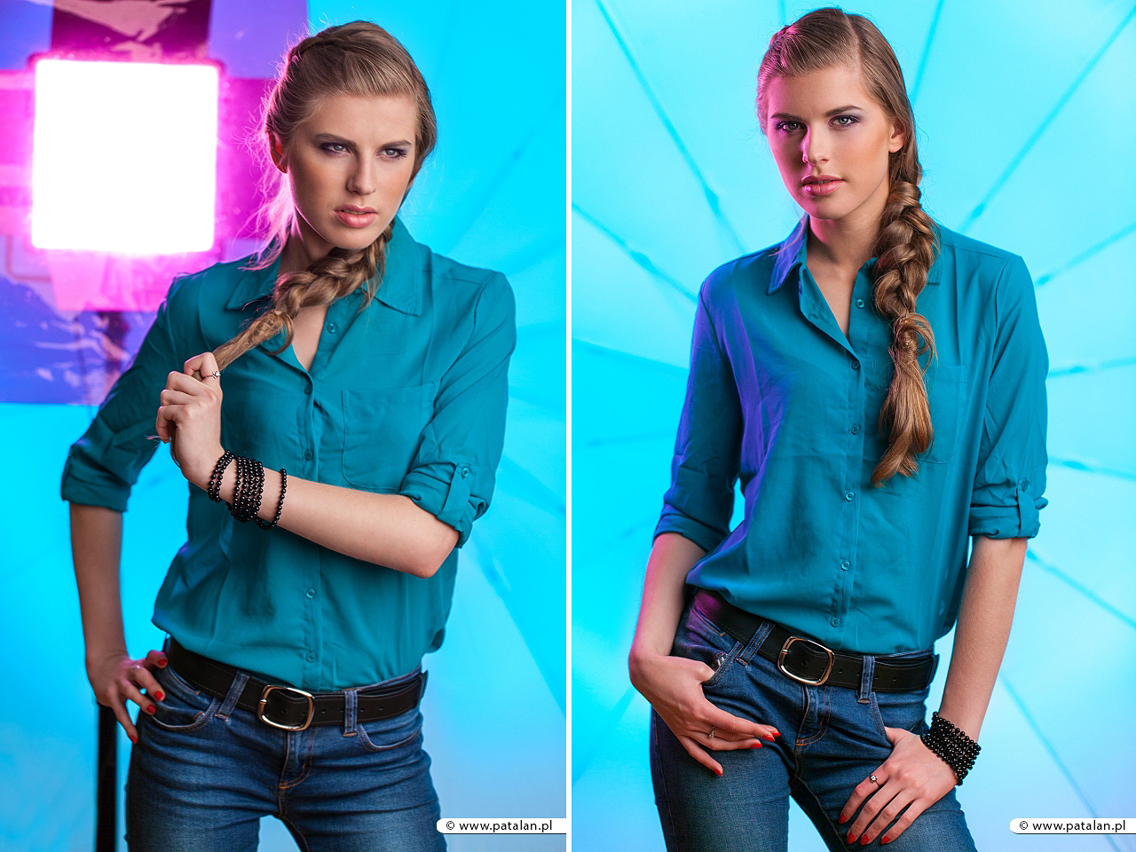 Trzeci setup to już bardziej skomplikowana sprawa jak się okazało. Zamysł był prosty w pierwszej fazie. Ustawić ogromny parasol jako tło, podświetlić go lampą systemową z kolorowymi żelkami i jako główne światło użyć lampę 1000w. I gdy to tak składaliśmy pewna osoba podeszła i mówi, że ma duże kolorowe folie estradowe w samochodzie, które może pożyczyć. Zauważył też pewną istotną sprawę. Otóż zorientowaliśmy się że problemem będzie odseparowanie temperatury barwowej poszczególnych lamp aby wszystko współgrało na zdjęciu. Pół godziny później okazało się że osobą, która tak mądrze nam podpowiadała był Paweł Klein. Prowadzący kolejny blok warsztatowy z fotografii produktowej. Czasu było nie wiele wiec w pośpiechu staraliśmy się ustawić odpowiednie wartości do setupu. Udało się nam to dopiero po ok. 20 minutach. Tym razem wykorzystaliśmy trzy lampy: jedną (światło ciągłe) za plecami modelki z folią estradową koloru morskiego, drygą ledową lampę (światło ciągłe) z prawej strony modelki z folią różową oraz jako główną lampę użyliśmy halogen (światło ciągłe) ze zmienną mocą 1000w oraz oktą. Ostatecznie wyszły nam takie zdjęcia z Sylwią.