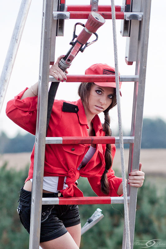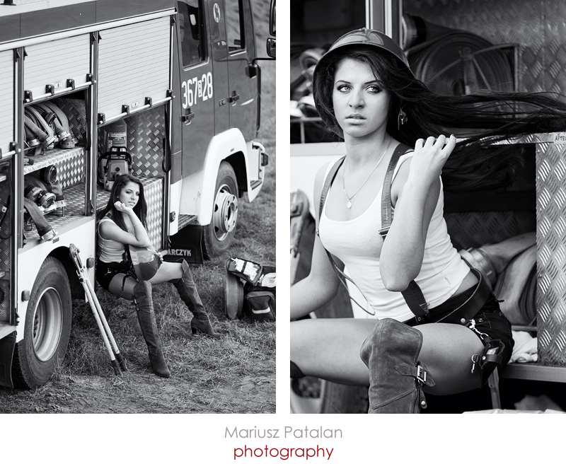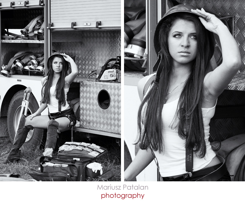 Początkowo miało być mocno sexy jednak z uwagi na nieletni stan mojej pięknej modelki odbiegliśmy w ostatniej chwili od tego zamysłu. Sylwia przygotowała moim zdaniem równie ciekawe i kuszące stroje na ten plener. Niestety prawdziwe mudry w jakie próbowaliśmy ubrać modelkę były za duże. Nasi strażacy to widocznie wielkie chłopy. Zdjęcia planowane były na sesję studyjną jednak z racji tego, że wóz strażacki nie zmieścił mi się do studia ;) postanowiliśmy zrobić zdjęcia w plenerze. Efekt stylizacji wyszedł moim zdaniem nawet owocniej ponieważ można było wykorzystać całe zaplecze jakim dysponuje nasza Straż Pożarna. Począwszy od zabawy sprzętem jak nożyce, topory, sprzęt ratowniczy, węże, mundury, drabina wysięgnikowa to Madzia ku jej zaskoczeniu miała okazję podczas sesji przejść również warsztaty strażackie wchodząc wysoko na drabinę czy też ugasić prawdziwy pożar trzymając pod ciśnieniem wąż strażacki. W głowach co sekundę rodziło się tysiące nowych pomysłów jednak słońce w tym okresie prawie jesiennym strasznie szybko zachodzi i po zmroku zdjęcia musieliśmy przerwać.